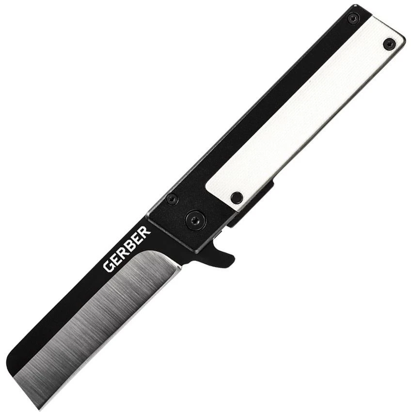 Model – G1703. Gerber Knives 1703 – Quadrant Framelock Knife White. 3.75″ closed. 2.75″ 7Cr17MoV stainless sheepsfoot blade. Black stainless handle with white G10 composite inlay. Extended tang. Pocket clip. Boxed. Made in China.